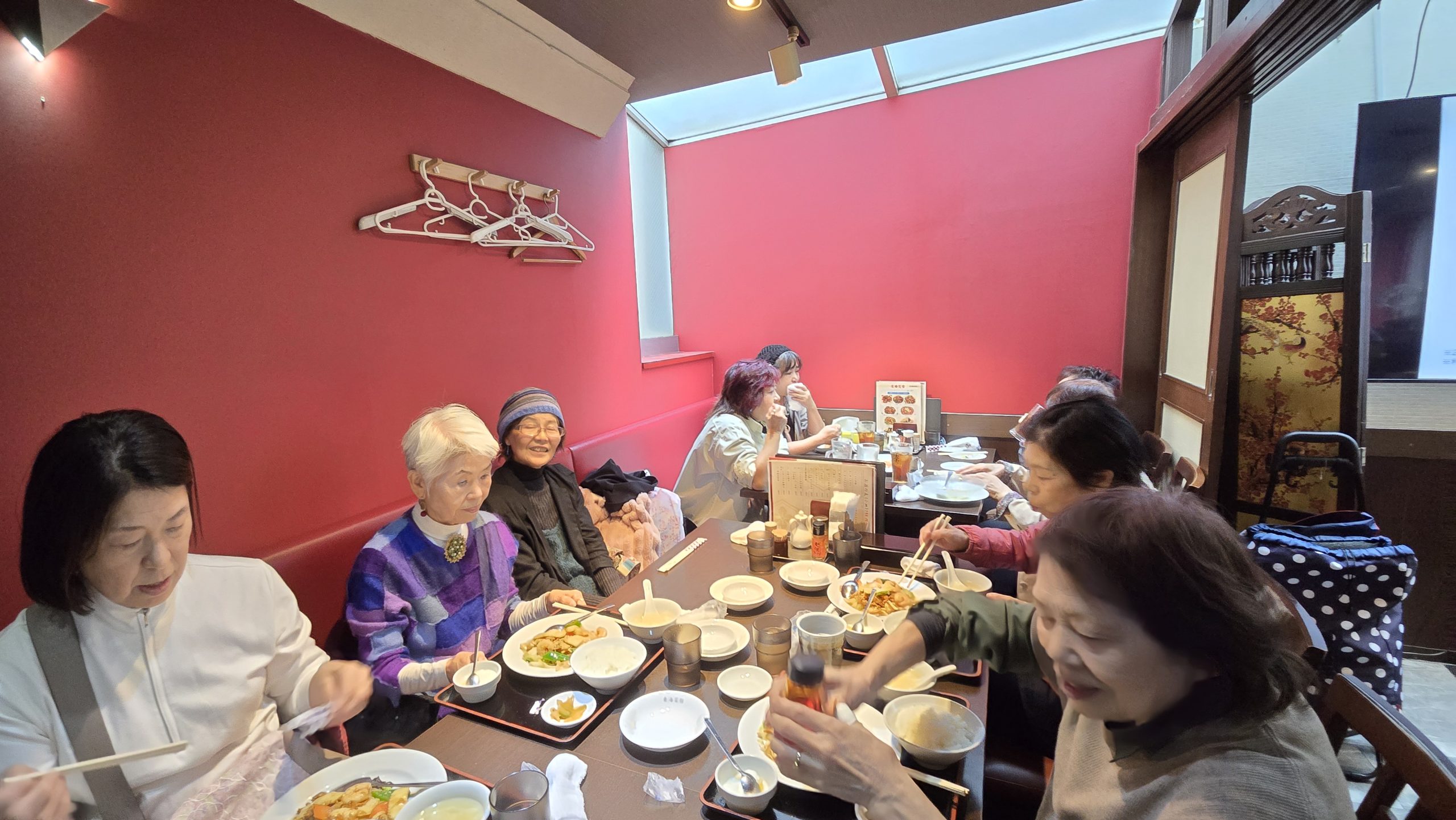 電車を乗り継ぎ現地に到着し、早速お昼ごはんを食べました。事前に予約しておいた中華料理屋さんに入ると、中はすでに満員という状況でした。