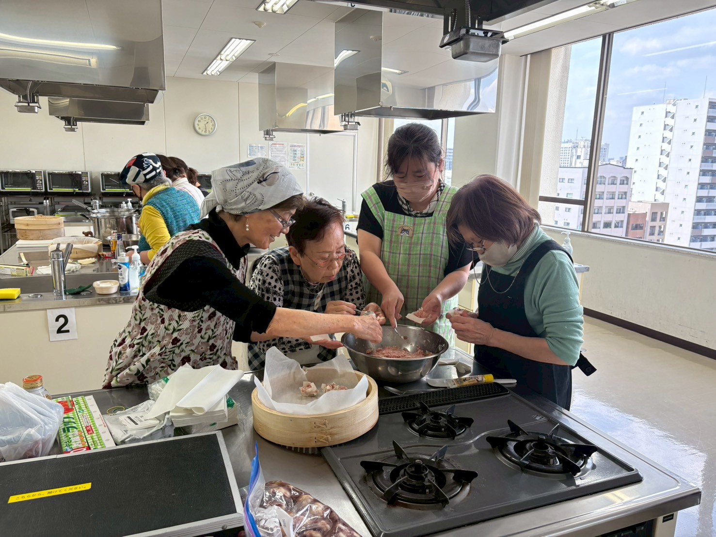 4/14(火)13:00より、総合区民センター調理室にて婦人部主催の「焼売を作る会」を開催、11名が参加しました。