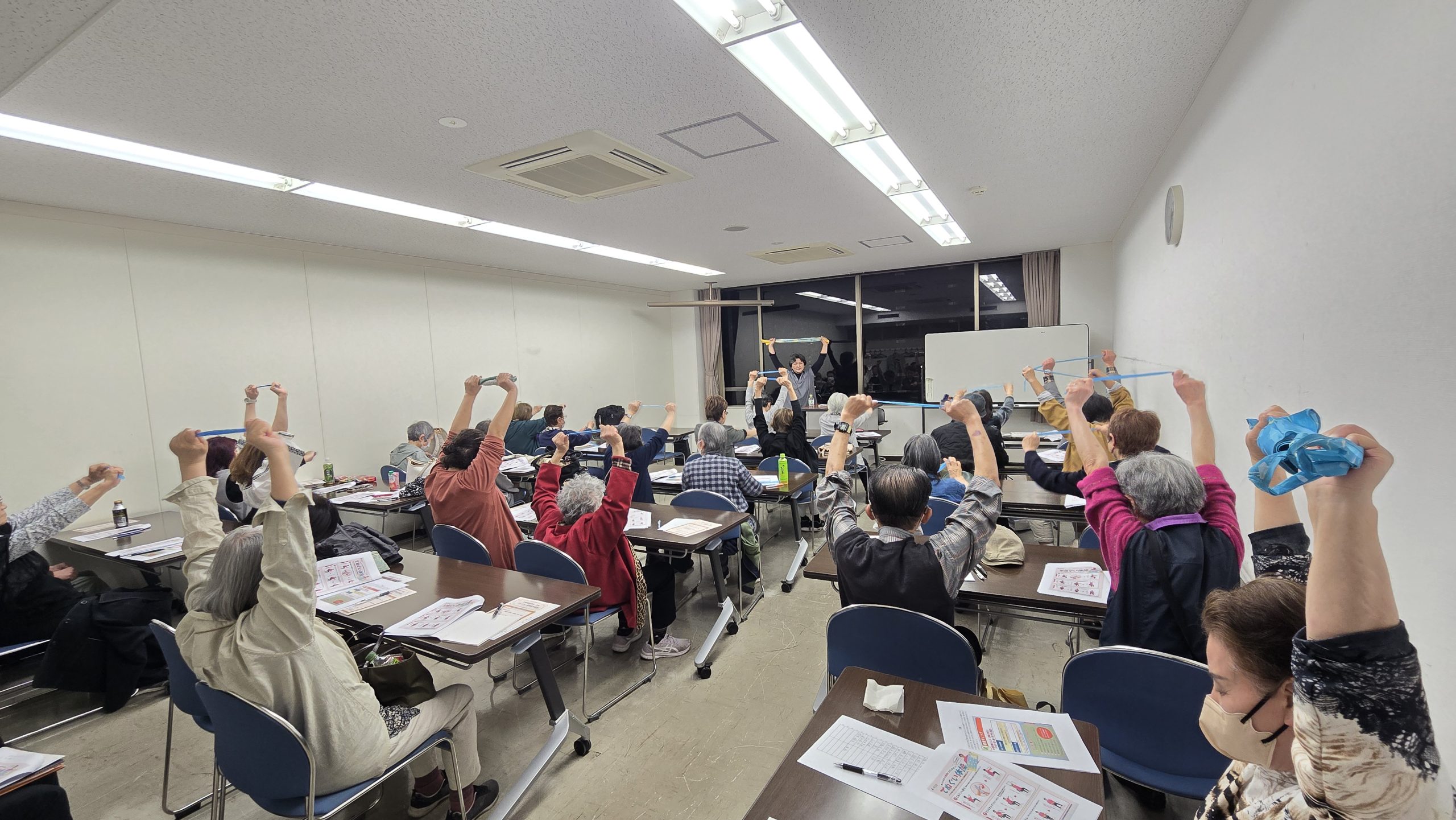 初めに、「フレイル」についての学習を行いました。介護が必要になる状態の”一歩手前”であるフレイルの症状や、予防のために大切な「活動と参加」、「体力」、「栄養」という3要素について学習しました。社会との関わりを保ち続け、他人と交流することがいかに重要かということや、積極的にお肉や魚などを食べることの必要性について語られ、自宅で簡単に出来る体操に関しては、参加者みんなで実演し盛り上がりました。
