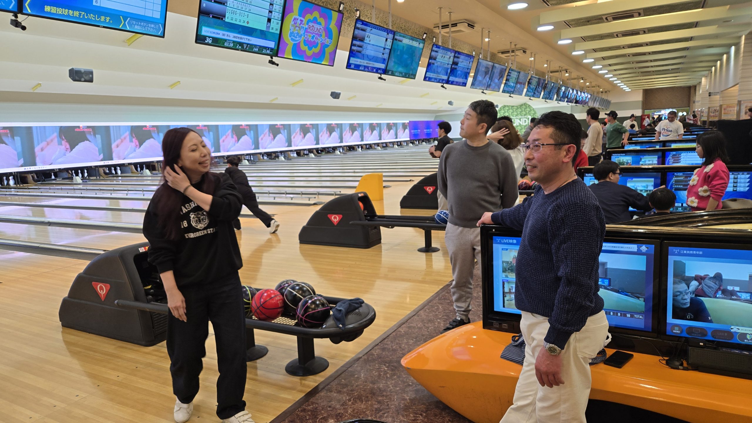 また、ラウンドワン独自の「ムーンライトストライクゲーム(暗闇の中、代表者がスタライクを狙って一斉に投球する)」で3人もスト ライクを出すことが出来たので、プリクラも3回撮影しました。参加者一同で、「学生にもどったみたいで本当に楽しい」と心から楽しむことができました。