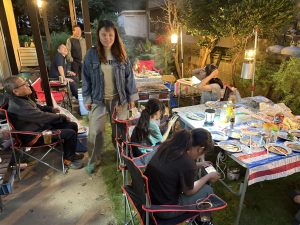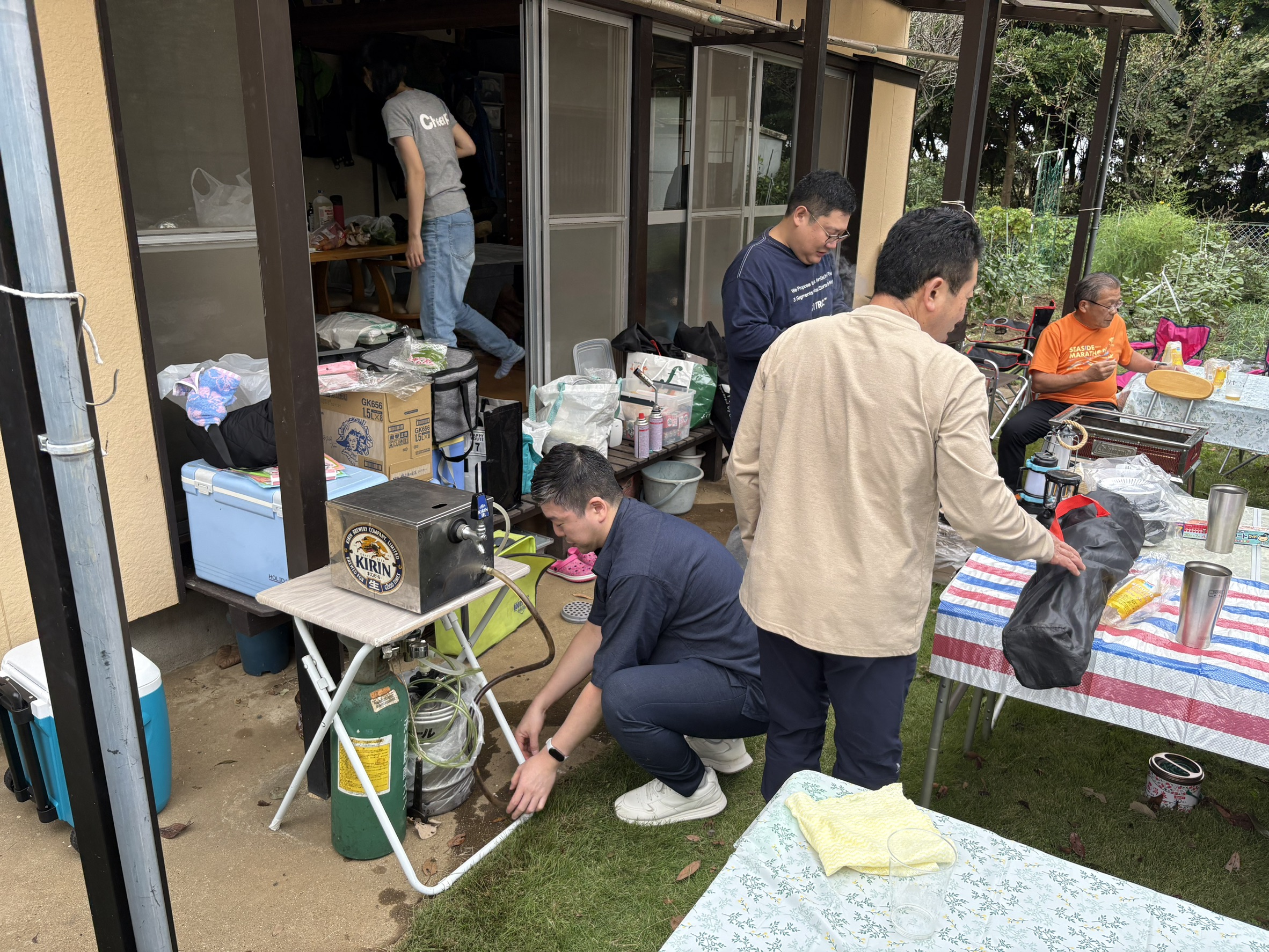 宿泊先に戻ってBBQの準備をスタートし、参加者一同が力を合わせて食材の準備やテーブル等のセッティング、火おこしなど手際よく進めていきました。
